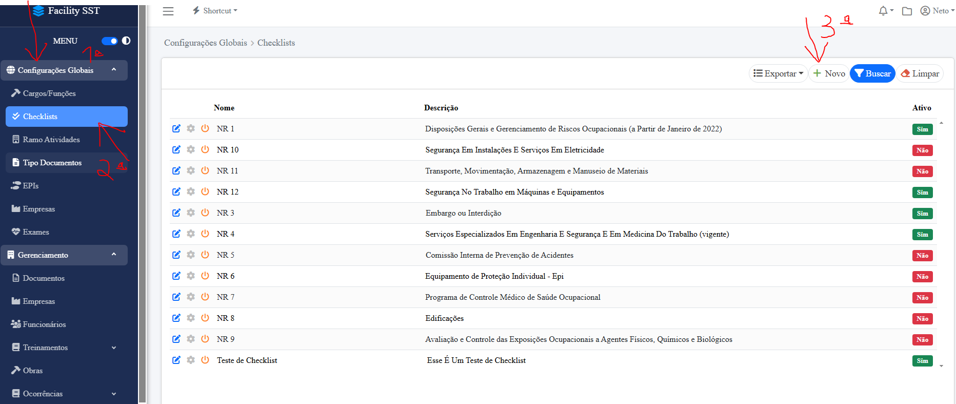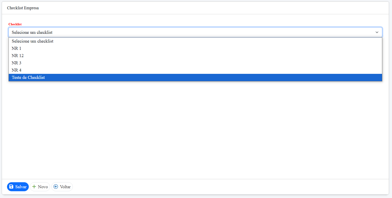 Ex: Hoje no sistema existem checklists padrões como: NR 1, 3, 4, etc.