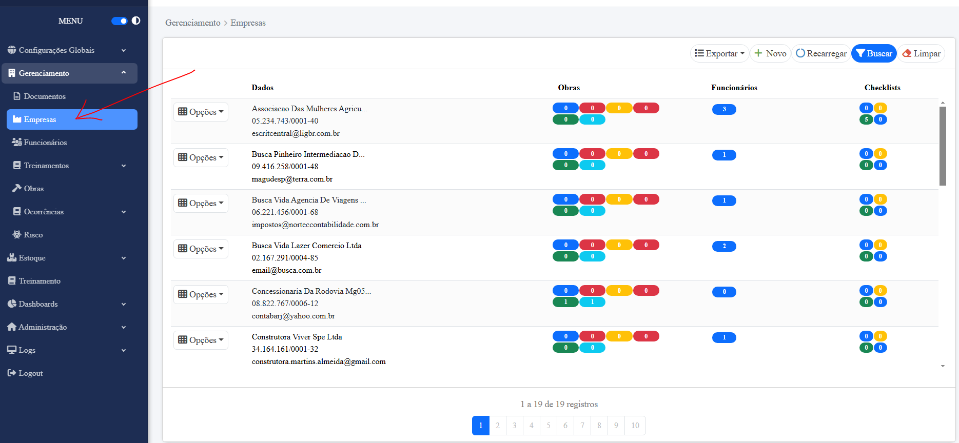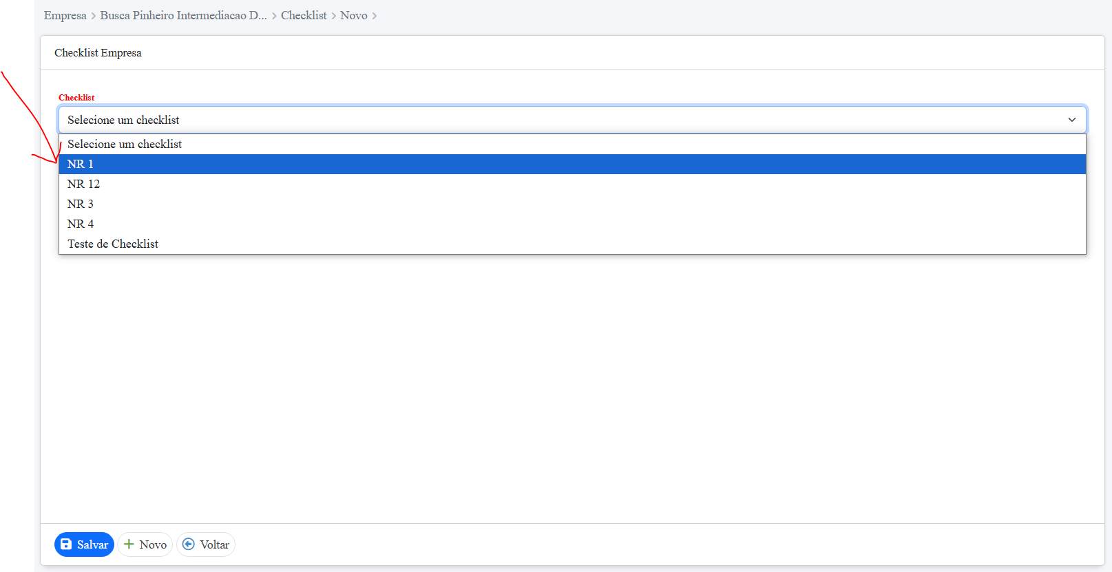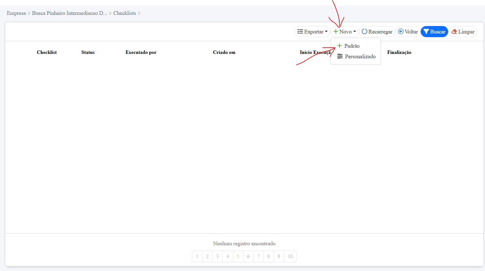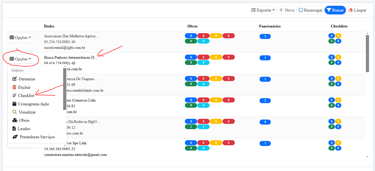 2ª Clicar na "Opções" da empresa "Busca Pinheiro Intermediação" e selecionar "checklist".